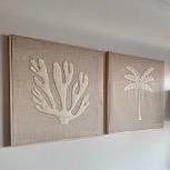 CUADROS BORDADO CORALES EN LINO GRIS. ARRIBA INODORO Y BIDET