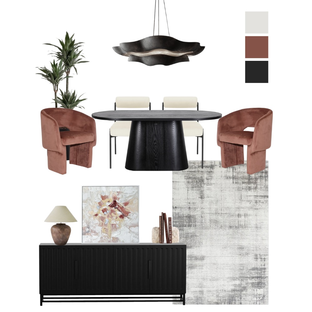 modern dining room contemporary dining room design neutral dining room earthy dining room palette terracotta dining chairs dark timber dining table sculptural dining lighting textured dining room rug modern dining furniture minimalist dining space