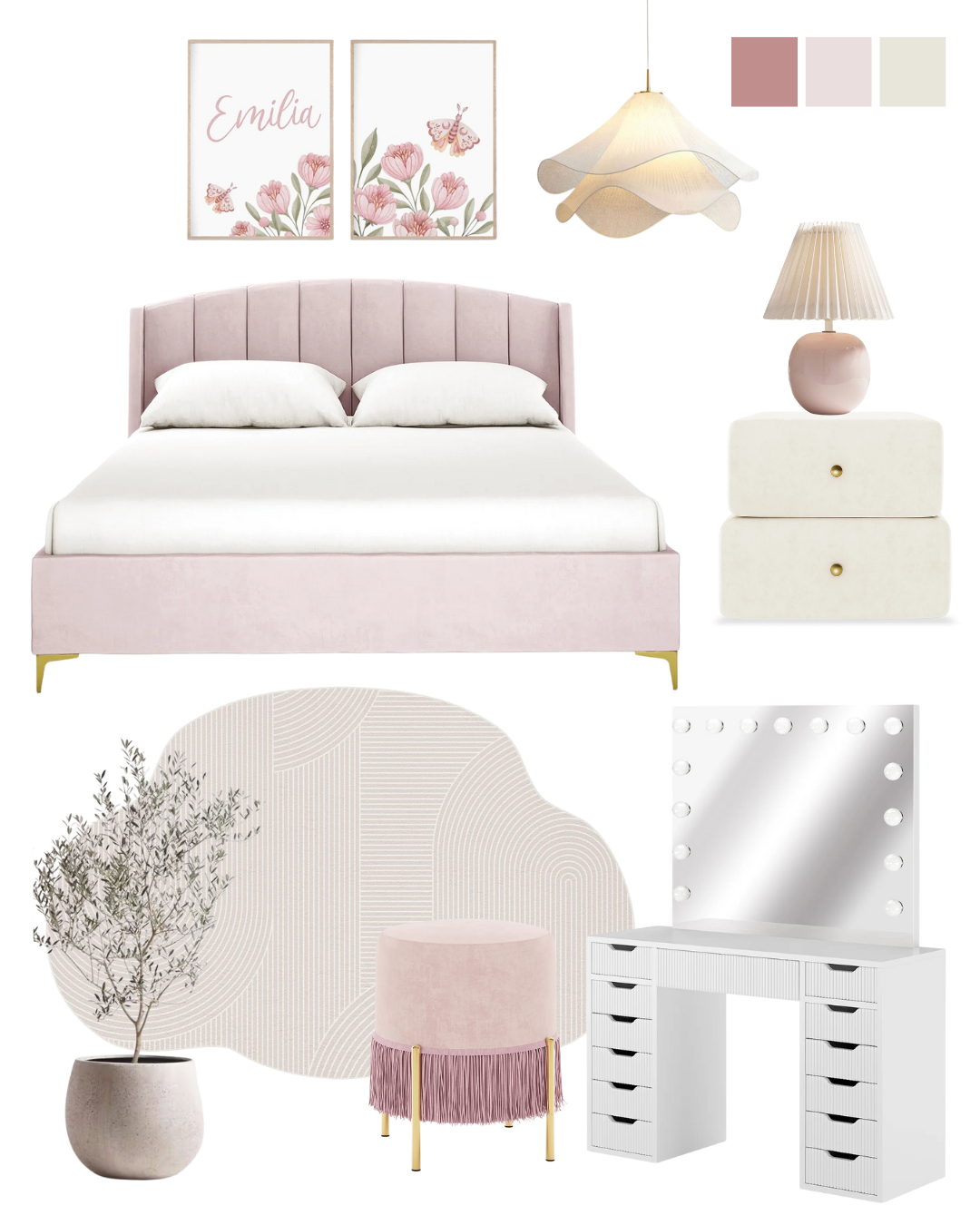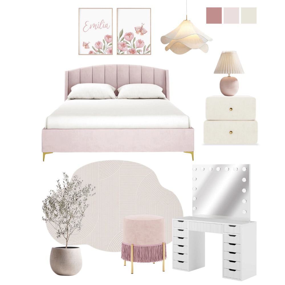 blush bedroom decor feminine bedroom aesthetic pink upholstered bed modern romantic bedroom pastel bedroom design soft neutral bedroom vanity styling bedroom whimsical bedroom decor modern feminine interior