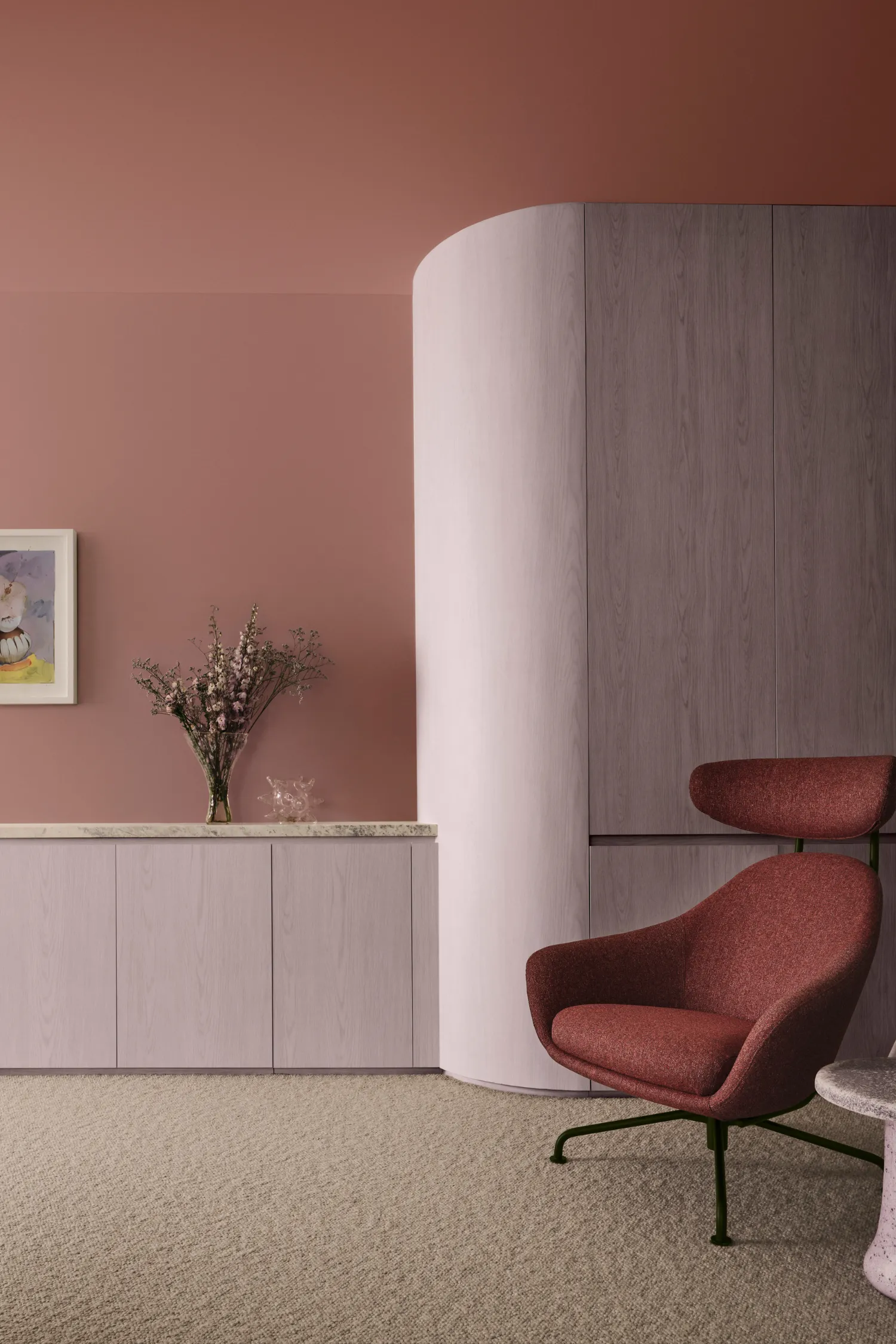 Whether in cabinetry, flooring, or furniture, deep timber tones bring a sense of permanence, grounding, and sophistication to spaces. Paired with lighter textiles, metal accents, or muted colour palettes, dark woods balance modernity with tradition, adding warmth and structure to interiors without overpowering them. Pantone’s ‘Cloud Dancer’ as the Colour of the Year 2026 is a perfect match for this contrast. For designers, it’s an invitation to explore layering, contrasting dark grains with soft neutrals, soft metals, or greenery for a nuanced and inviting result.