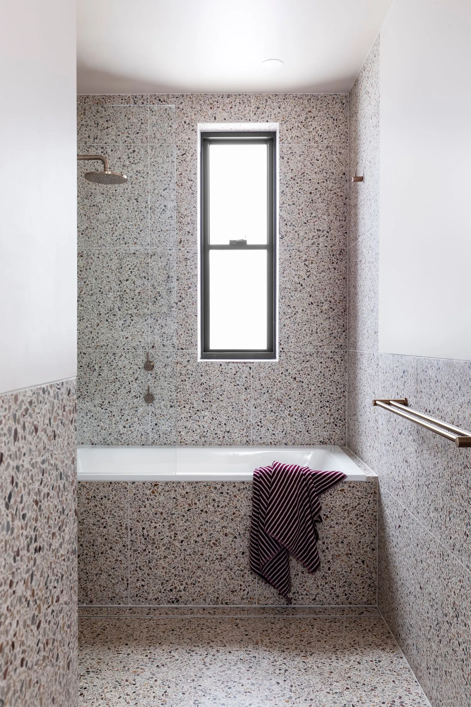 If you’re building a bathroom mood board, combine the terrazzo with natural oak cabinetry, matte tapware, and soft taupe towels to strike the perfect balance between sophistication and playfulness.