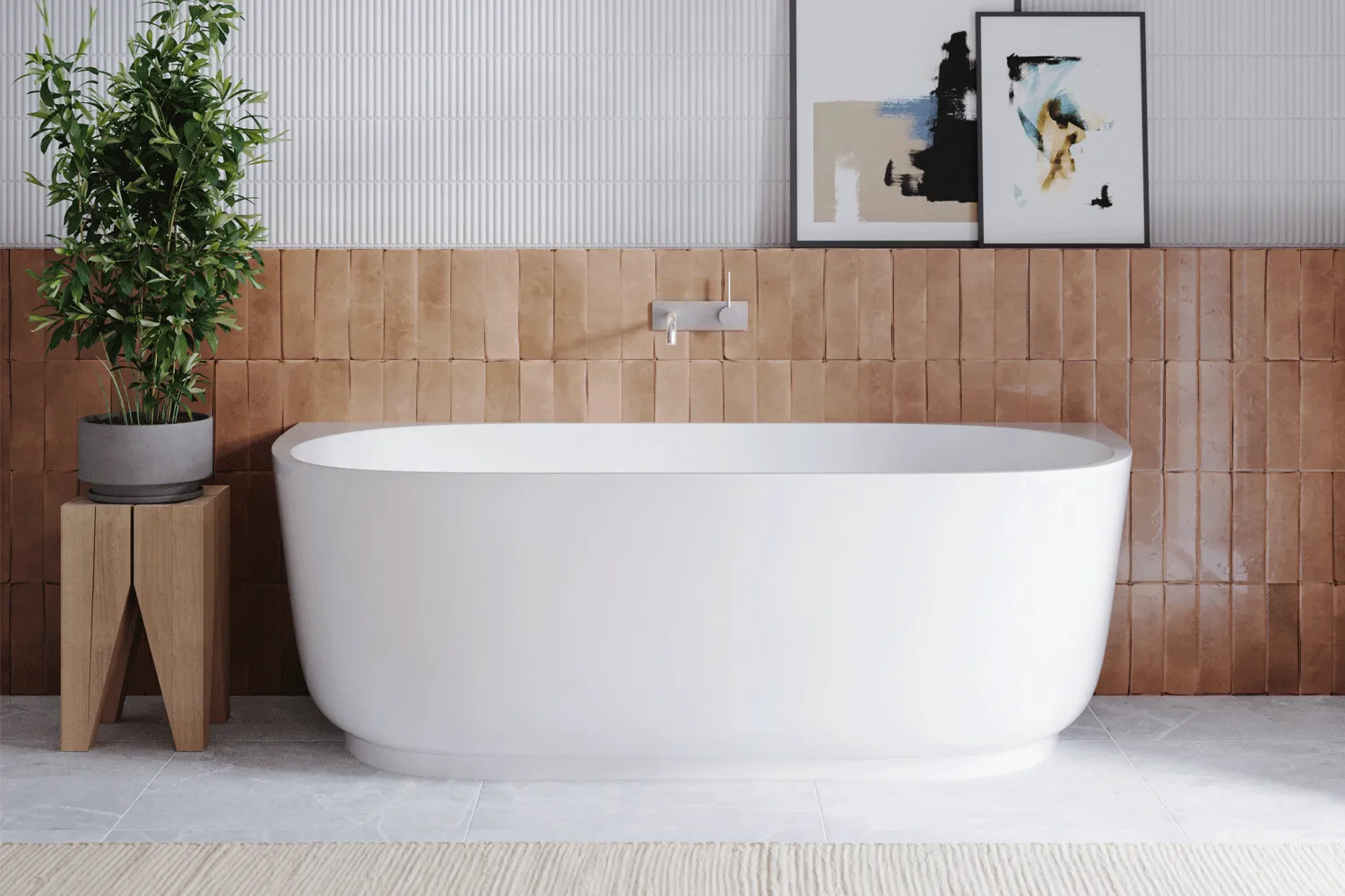 Styling tip: Soften the intensity of terracotta with creamy plaster walls, curved forms, and soft lighting. Try Gioia Wall Art’s Colorado print above a vanity or lean into the palette with Aquaperla Above Counter Basin for a cohesive, warm-toned scheme.