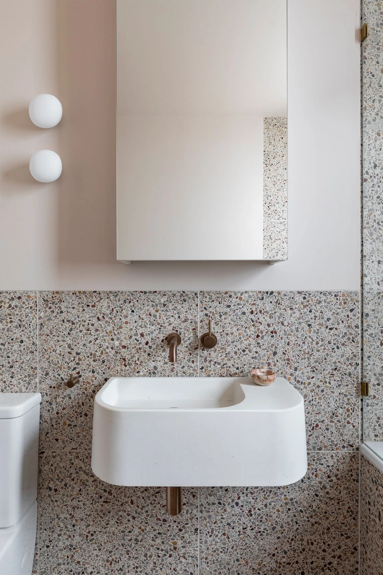 Brands like WK Stone and The Blue Space are offering beautiful reinterpretations, from soft neutral terrazzo with blush undertones to bold, speckled statement tiles that steal the show. Terrazzo works especially well in powder rooms, where you can afford to push boundaries with colour and pattern.