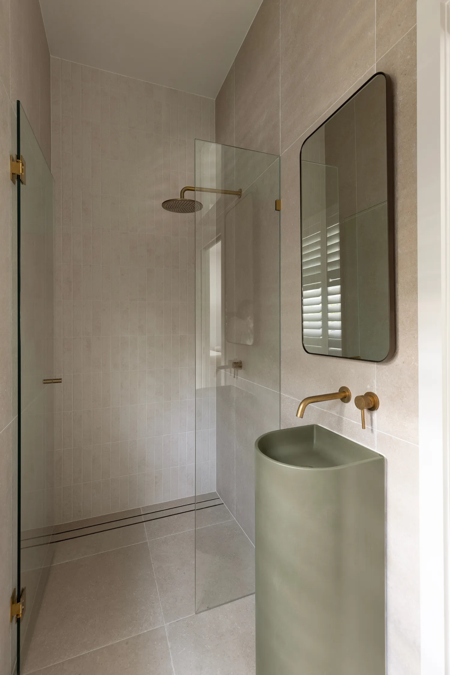 In the bathroom, the palette remains neutral and calming (exactly how you want the aura of a bathroom to be, especially with a bath as large as this!). The stone-look freestanding bath becomes the statement of the room, framed by soft beige walls that enhance the sense of serenity. Bronze ABI tapware and slim bronze towel rails introduce warmth and cohesion, tying back to the finishes used throughout the home. A white oval bowl sink, rectangular mirror and beige vanity keep the look clean and timeless, while brown kit kat tiles in the shower add texture and visual interest without overpowering the space.