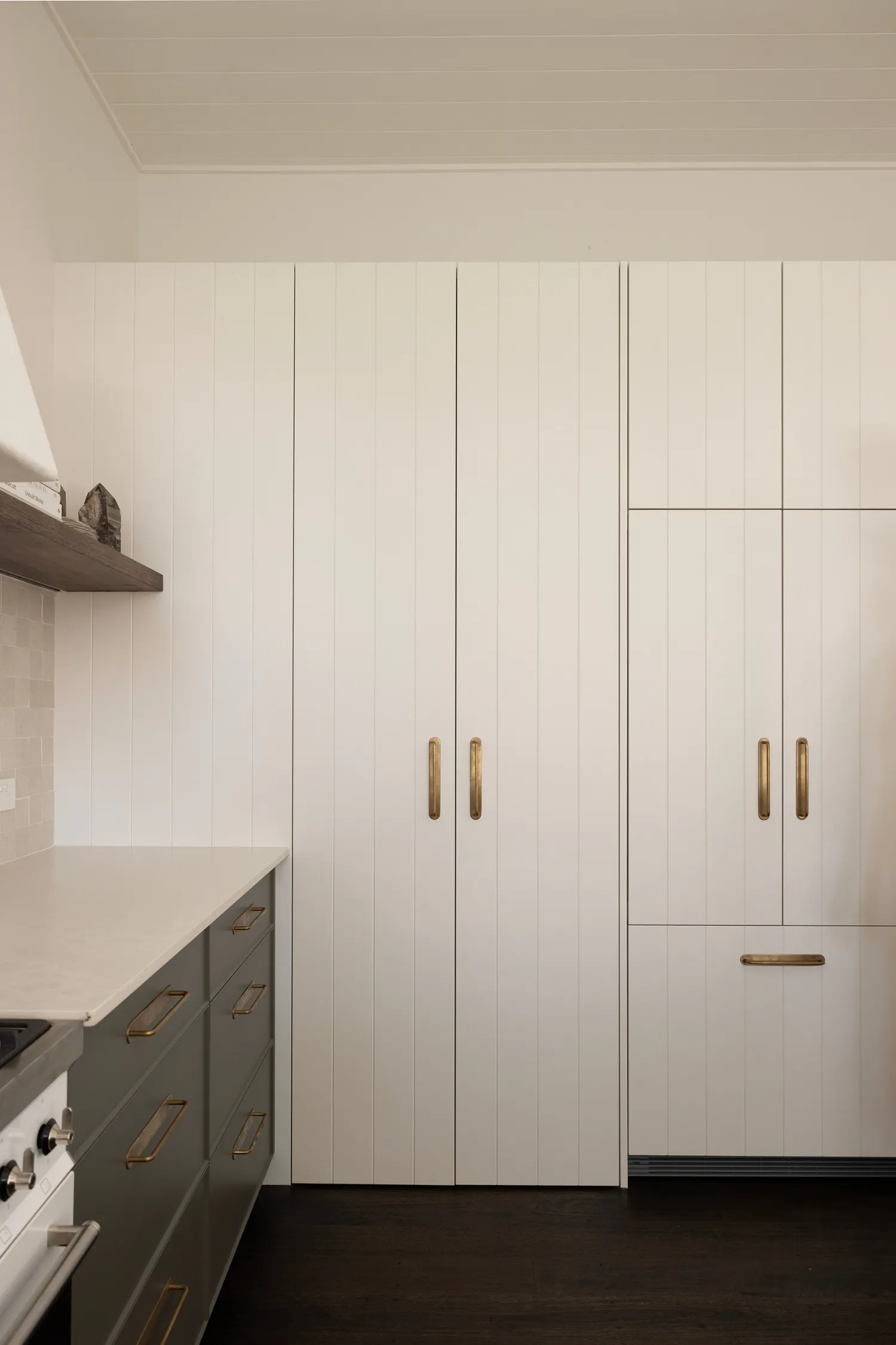 The kitchen sets the tone for the rest of the home, with a relaxed neutral palette that continues through each room. Crisp white cabinetry is paired with dark timber flooring, creating contrast and warmth underfoot. Bronze handles add a subtle metallic accent, echoed beautifully in the bronze gooseneck tapware. Brown leather bar stools with elegant gold legs introduce a touch of understated luxury, while small square beige stone-look tiles on the walls provide texture and a softly coastal feel. Open timber shelving styled with greenery brings the outdoors in, which feels like an essential ingredient for Byron homes.