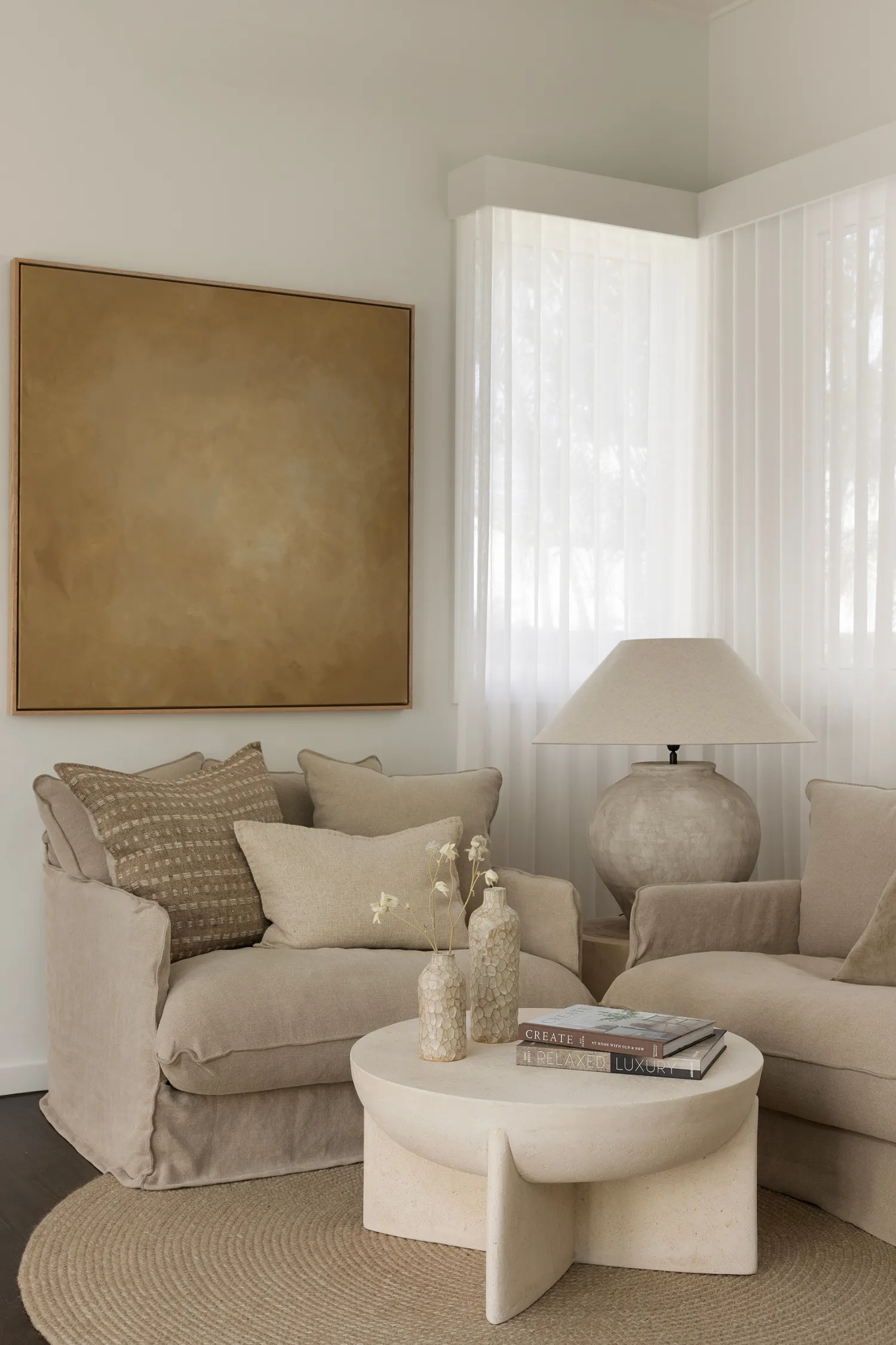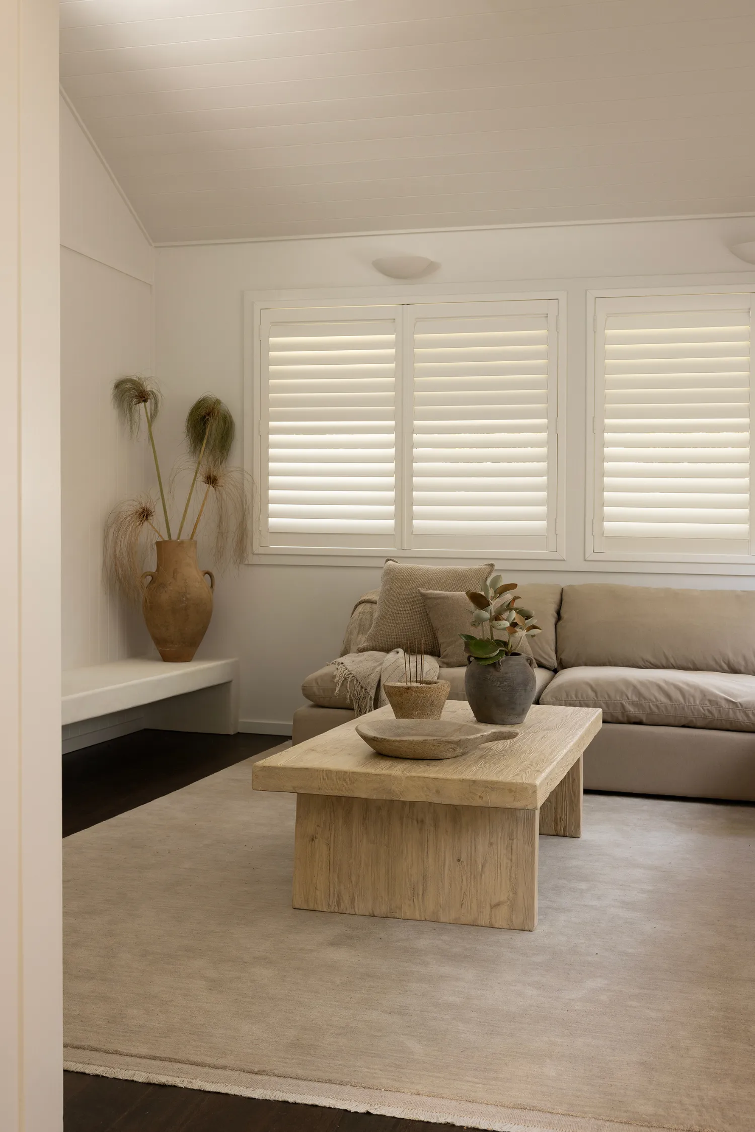 The living area is designed for slow mornings and relaxed afternoons (that’s what we imagine here). A chunky pale oak coffee table grounds the room, paired with a soft cream rug that invites barefoot living, aligning perfectly with coastal life. White Venetian blinds filter natural light, while a deep, neutral-toned rectangular sofa anchors the space, being plush, generous and effortlessly inviting. It’s a room for relaxation.