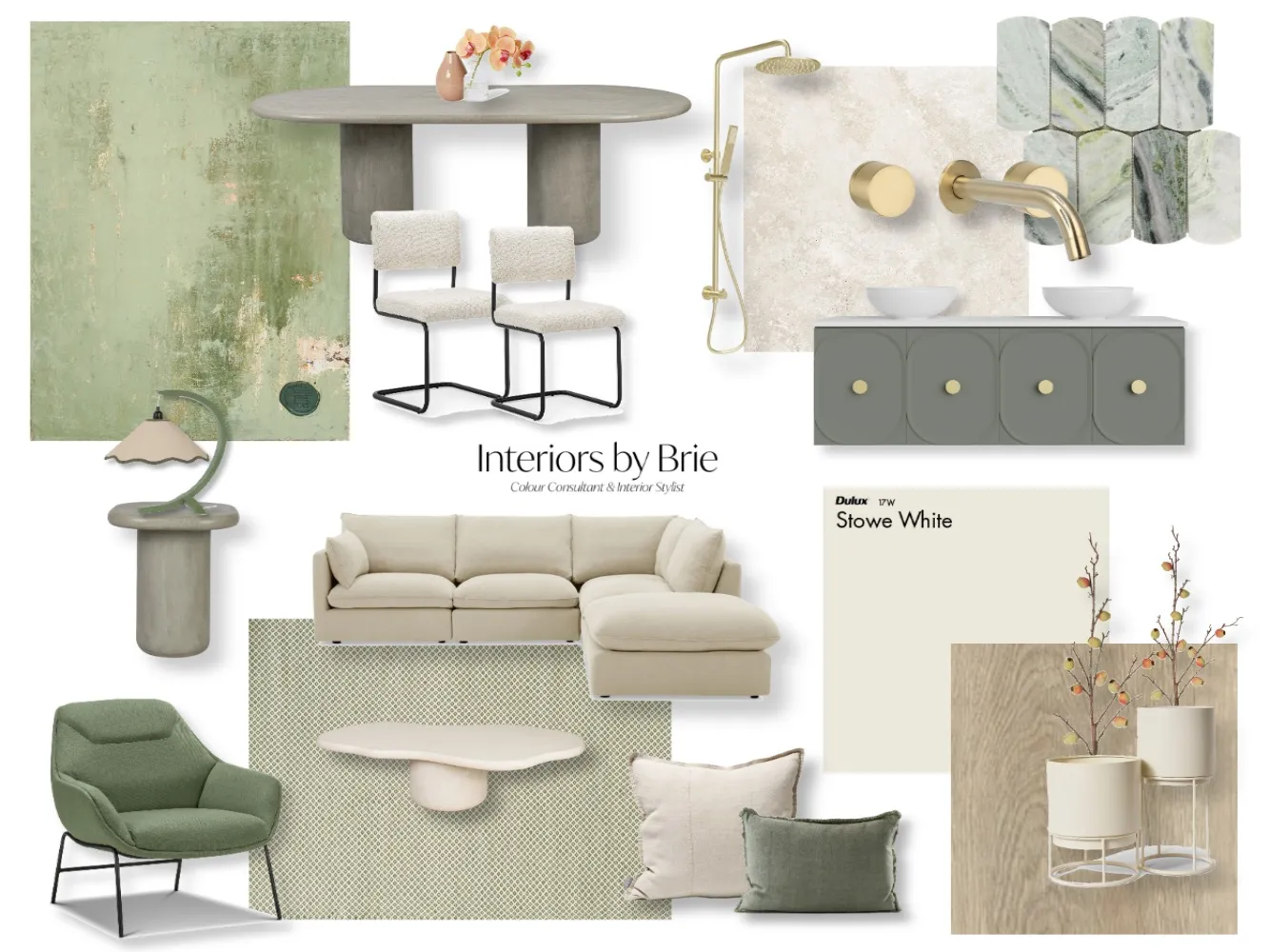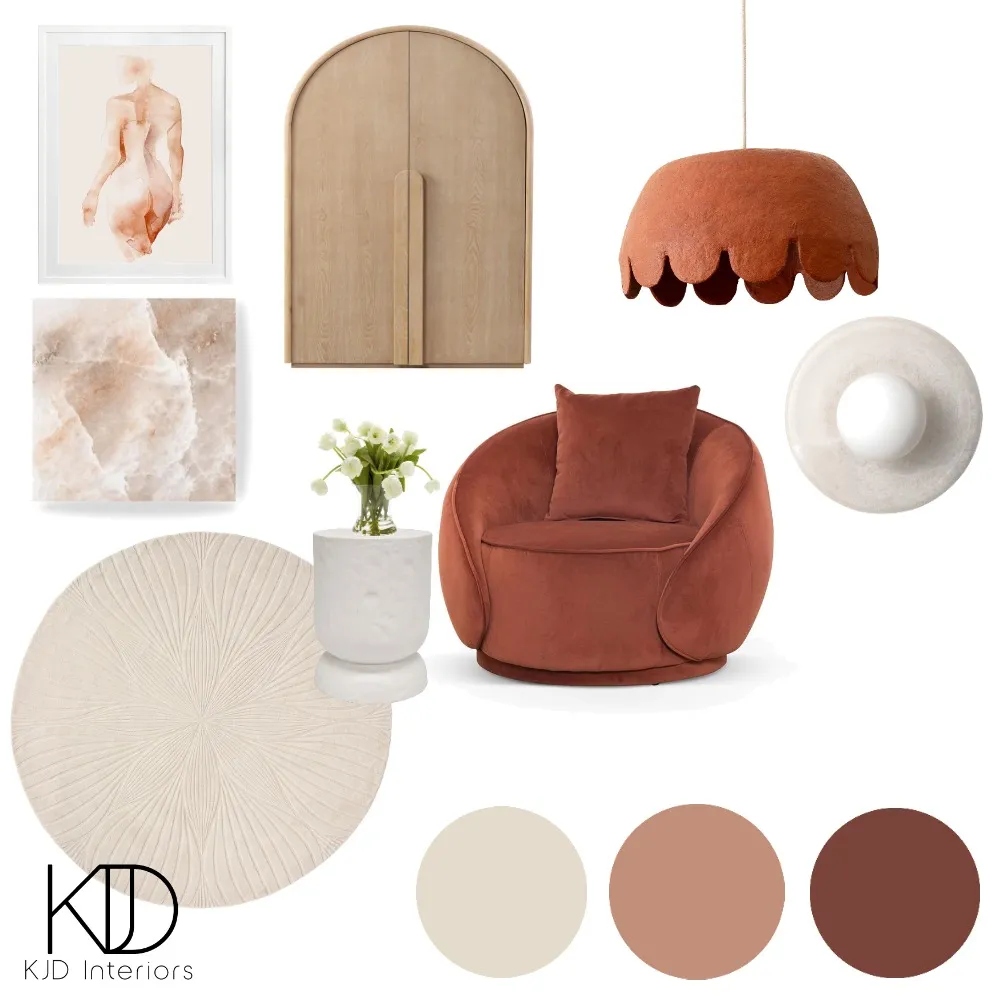 When designing your mood board, use warm neutrals as your base layer. Start with flooring, large furniture pieces and joinery selections in soft, earthy tones. Then build upward with bolder accents in clay and olive. This layered approach ensures the space feels intentional rather than themed.