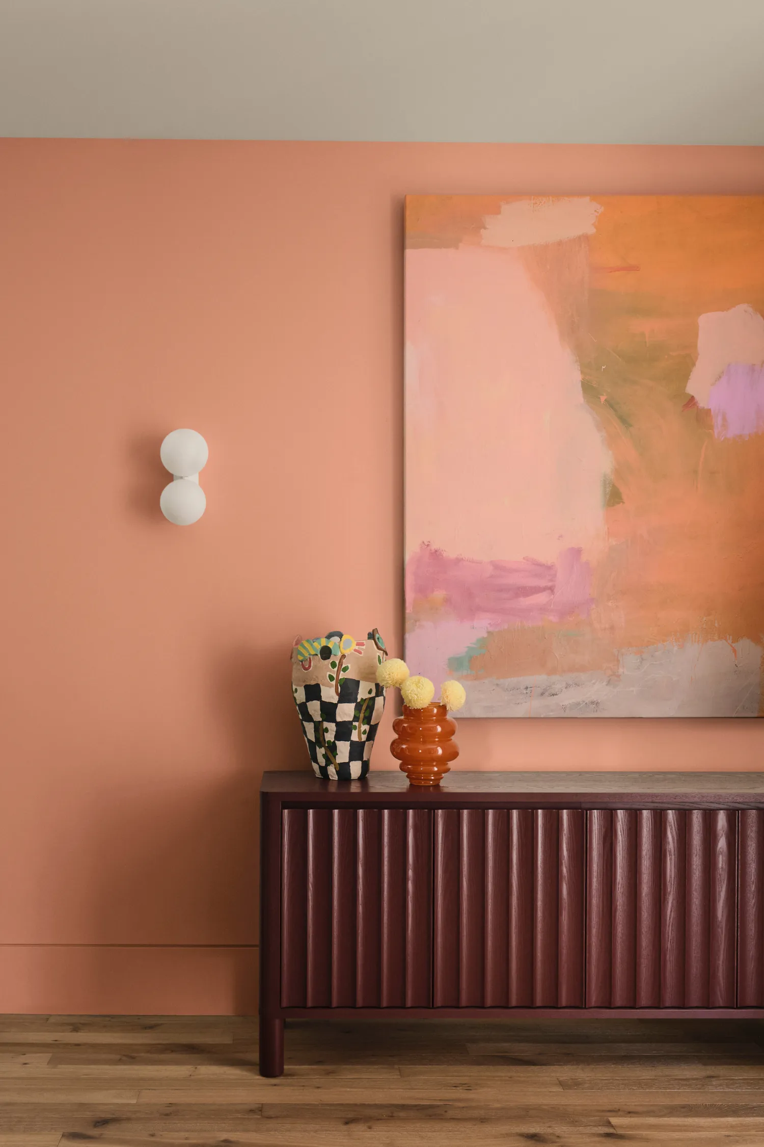 To bring Evoke to life, consider walls in Dulux Magic Melon or Dulux Baked Clay, paired with tactile furniture from James Lane or Lounge Lovers with soft velvets, curved forms, and statement pieces that invite touch. Layer in patterned cushions or throws from OZ Design, alongside abstract or botanical art from Gioia Wall Art, to create movement and personality, while GlobeWest timber furniture in walnut or oak provides grounding natural warmth.