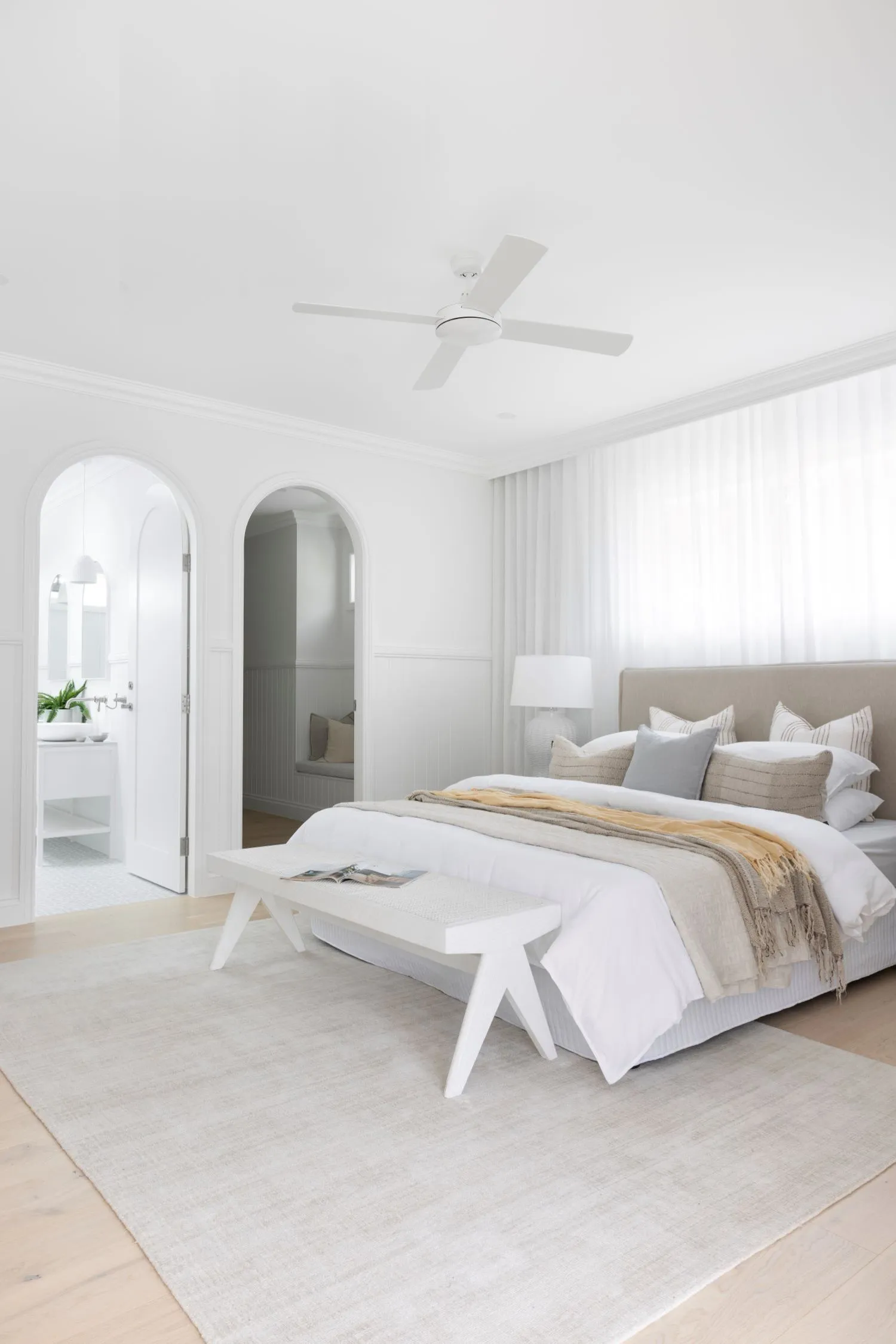 Bedroom: Make it a cocooning retreat. Linen bedding, wool throws, and soft lighting help the room breathe while encouraging rest and renewal.